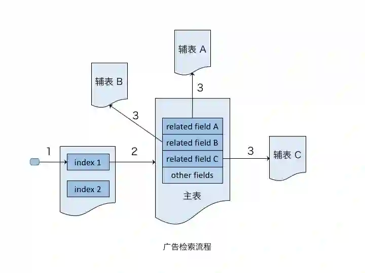 一般地,广告检索、排序等均基于广告组粒度,广告的倒排索引也是建立在广告组层面。借鉴关系数据库的概念,可以把广告组作为正排主表(即一个Adgroup是一个doc),并对其建立倒排索引;把广告主、推广计划等作为辅表。主表与辅表之间通过外键关联。