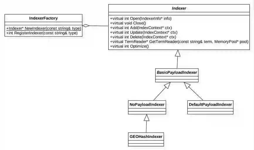 具体的Indexer仅需实现各接口方法,并将该类型注册到IndexerFactory,可通过工厂的NewIndexer方法获取Indexer实例,类图如下: