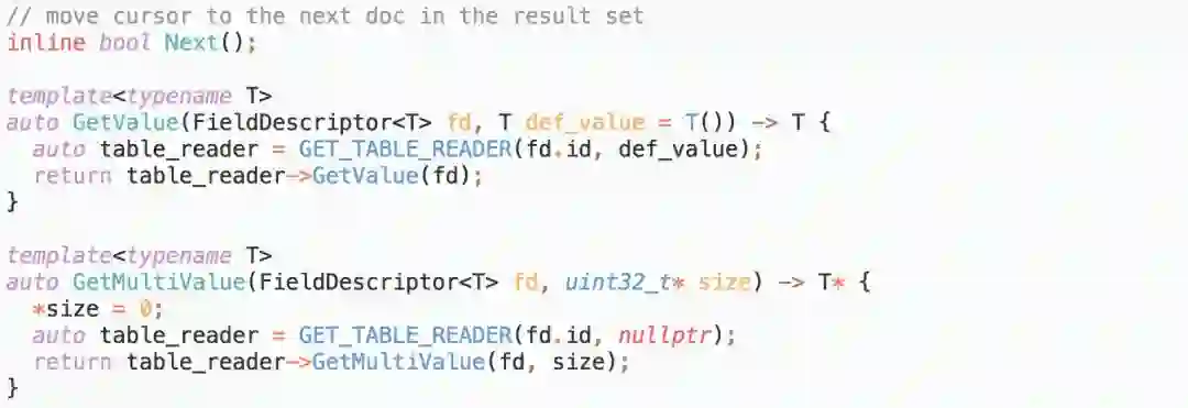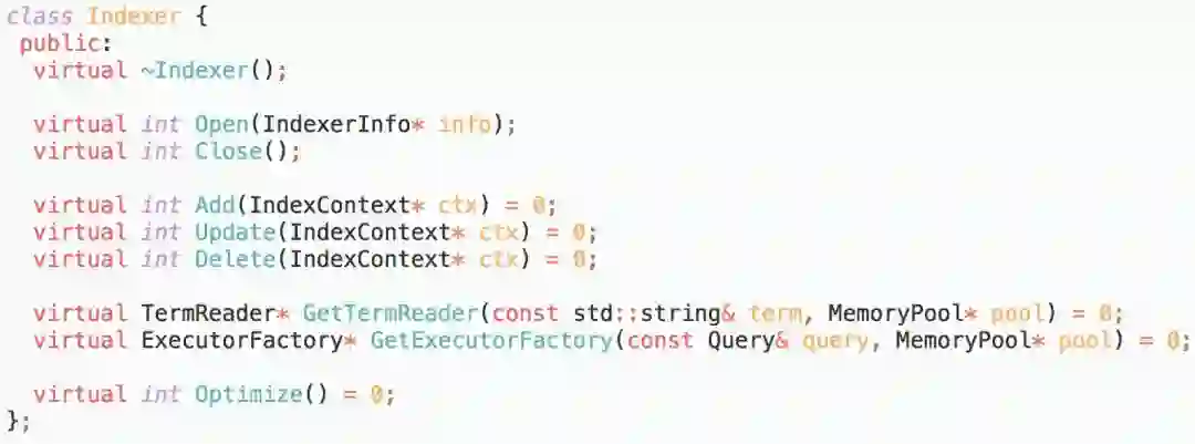 正排表、主辅表间的关系等是相对稳定的,而表内的字段类型需要支持扩展,比如用户自定义数据类型。甚至,倒排表类型也需要支持扩展,例如地理位置索引、关键词索引、携带负载信息的倒排索引等。通过继承接口,实现更多的定制化功能。