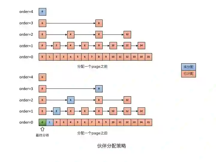在此简要阐述伙伴分配器的处理过程,为有效管理空闲块,每一级order持有一个空闲块的FreeList。设定最大级别order=4,即从order=0开始,由低到高,每级order块内页数分别为1、2、4、8、16等。分配时先找满足条件的最小块;若找不到则在上一级查找更大的块,并将该块分为两个“伙伴”,其中一个分配使用,另一个置于低一级的FreeList。