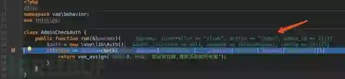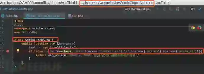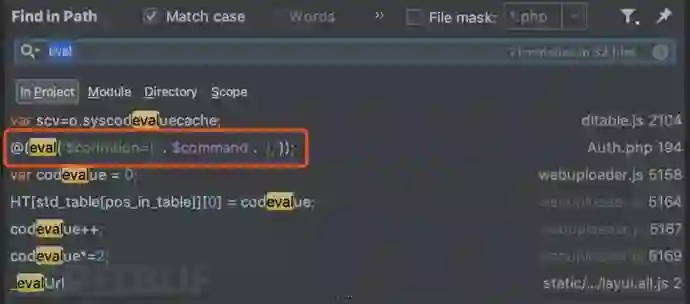 在PHP中常见的代码执行函数有eval、system等等,通过command+shift+f进行全局搜索这些函数名关键词来找到切入点。经过一番排查,最终定位到了一个比较可疑的地方listenrain/vae/lib/Auth.php第194行中的getAuthList函数: