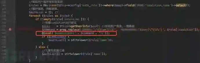 分析后可以确定,数据库中用户拥有的权限对应的规则的condition字段将会作为eval()的参数被执行