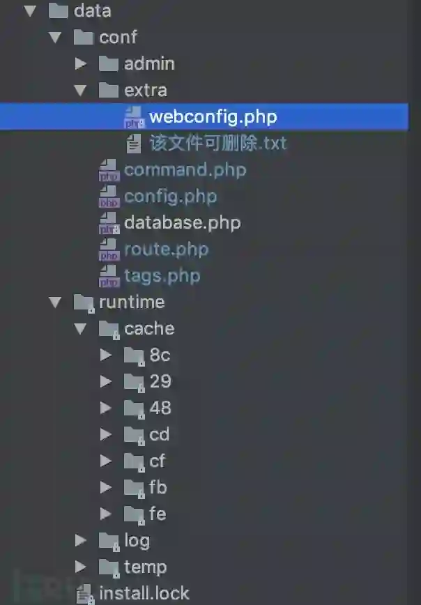 欣喜地发现,输入的配置内容写入了data/conf/extra/webconfig.php中,并且同时注意到,输入的配置内容同样写入了日志文件data/runtime/log/201905/1557823231-14.log。