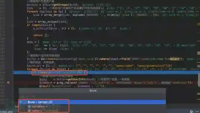 $rule是从186行 $rules = Db::name($this->config['auth_rule'])->where($map)->field('condition,name')->select();数据库中查询得到的数据的一部分。从作者的注释可以看到,读取的是用户组所有权限规则。