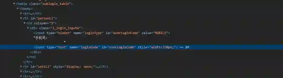 定义一个函数用户打开网站,输入用户名和密码以及验证码 page.type 中的元素地址,我们可以参考上面快速查找元素部分来通过chrome 开发者模式调试获取元素路径,我们可以看到这个网站他的id 为 userLoginCode 的 input 有2个,但是他们的name 是不一样的,所以我们可以这样去选择。