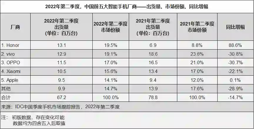放眼整个中国市场,2022 年第二季度智能手机销量同比下降 14.7%,基本跌回十年前水平。IDC 数据显示,主流大厂之中仅有荣耀、苹果实现增长。