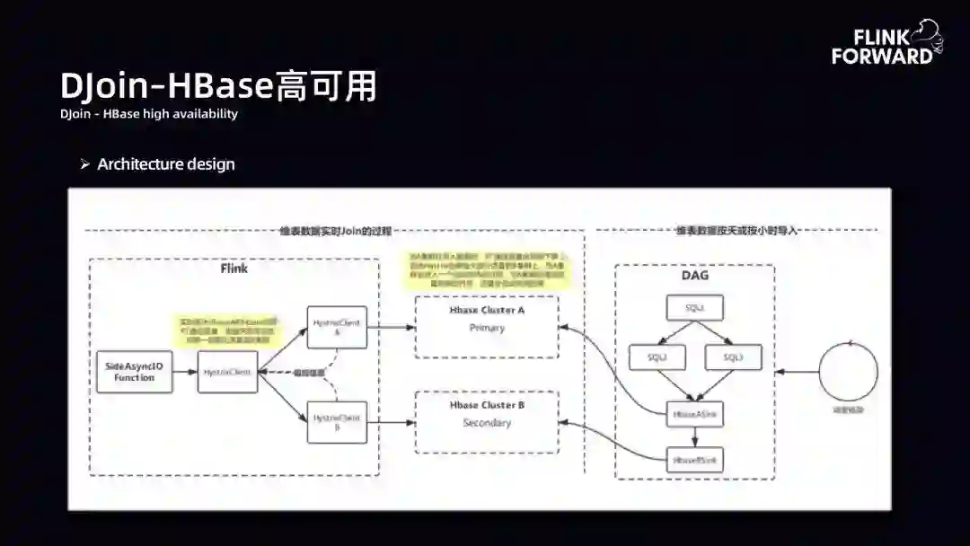 DJoin-HBase 高可用:维表数据达到T级别时使用 HBase 进行数据存储。HBase 高可用性采用双 HBase 集群,Failover AB 模式。这时需要考虑两个问题。第一是数据更新机制。数据更新可以是按小时或按天,采用 HFile BulkLoad 模式,串行+ Interval 间隔导入,导入后同步数据预热,以此保证两套HBase 集群的稳定性。第二是数据查询机制。引入 Hystrix 实现服务熔断、降级回退策略。当 A 集群可用性下降时,根据 AB 的 RT 质量,动态切换一定数据到B集群,以保证数据流量均衡。