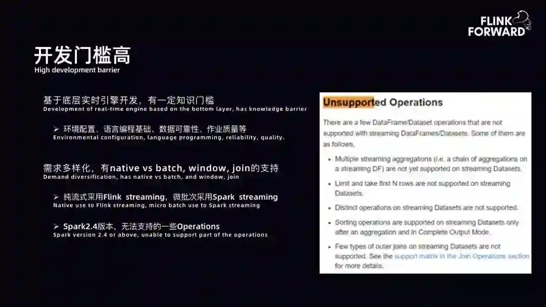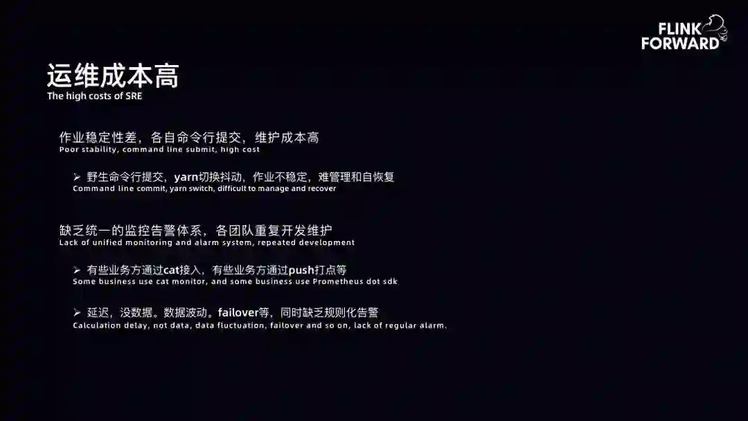 运维成本高:运维成本主要体现在两方面。首先是作业稳定性差。早期团队有 Spark 集群、YARN 集群,导致作业稳定性差,容错等方面难以管理。其次,缺乏统一的监控告警体系,业务团队需要重复工作,如计算延时、断流、波动、故障切换等。