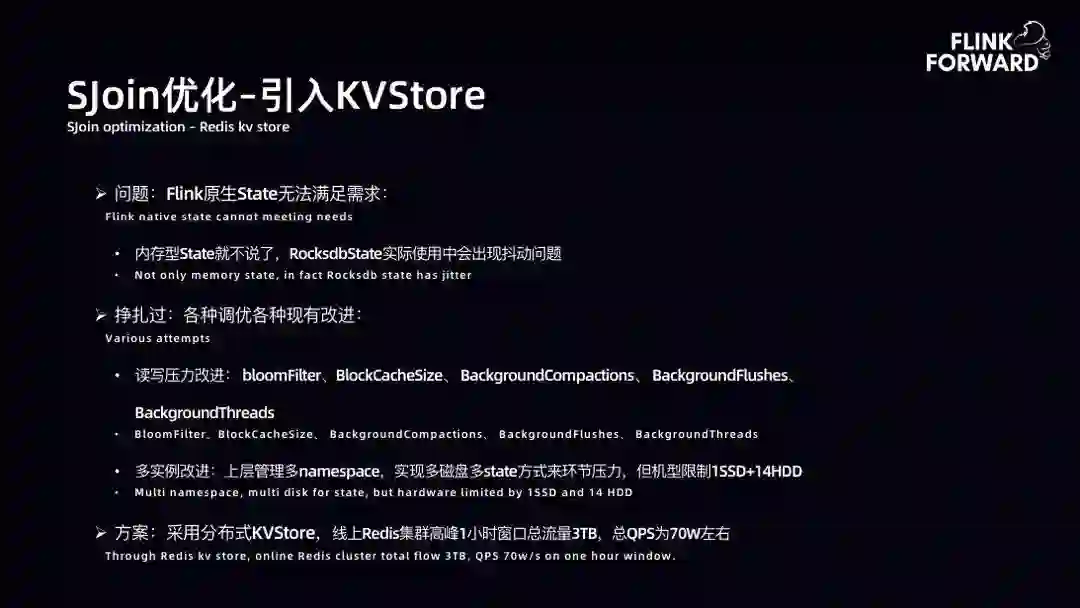 SJoin 优化-引入 KVStore:Flink 原生 State 无法满足要求,在对 Value、IO 要求高时抖动严重,RocksDBState 实际使用中会出现抖动问题。对此,bilibili 尝试过多种改进方案。开 1 小时窗口,数据量约 700G,双流 1 小时窗口总流量达到 TB 级别。采用分布式 KVStore 存储,后续进行压缩后数据量约 700G。