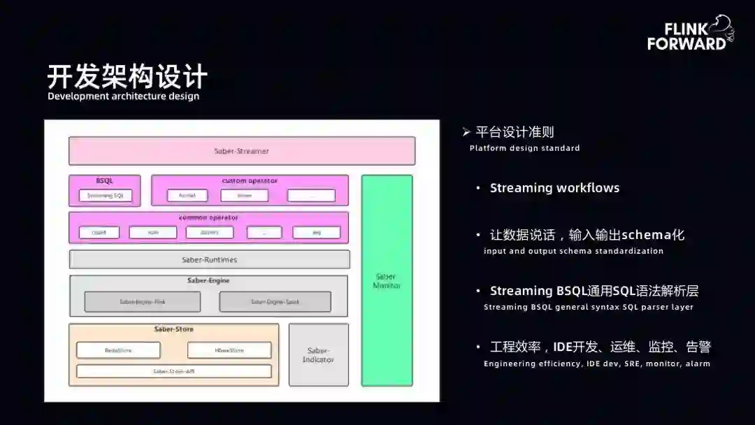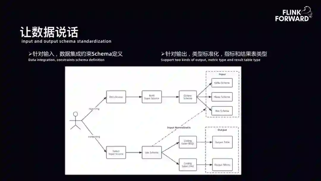 让数据说话:数据抽象化。计算过程中的数据源于数据集成的上报。数据集成的上报有一套统一的平台入口。用户首先需要在平台上构建一个输入的数据源。用户选择了一个对应的数据源,平台可以将其分发到 Kafka、 HBase、 Hive 等,并且在分发过程中要求用户定义 Schema。所以在数据集成过程中,可以轻松地管理输入语言的 Schema。计算过程中,用户选择 Input Source,比如选择一个 HBase 的表或 Kafka 的表,此时 Schema 已是强约束的。用户通过平台提供的 BSQL 或者 DAG 的方式进行结果表或者指标的输出。