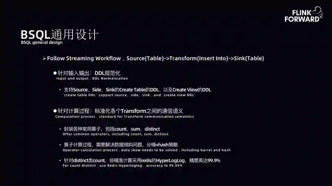 BSQL 通用设计:BSQL 是遵照 Streaming workflows 设计的思想,核心工作围绕 Source、Transform 以及 Sink。Transform 主要依托 Flink SQL,所以 BSQL 更多是在 Source 和 Sink 上进行分装,支持 DDL 的分装。此处 DDL 参照阿里云对外资料进行了扩展。另外,BSQL 针对计算过程进行了优化,如针对算子计算的数据倾斜问题采取分桶 + hash 策略进行打扫。针对 distinct 类 count,非精准计算采用 Redis 的 HyperLogLog。