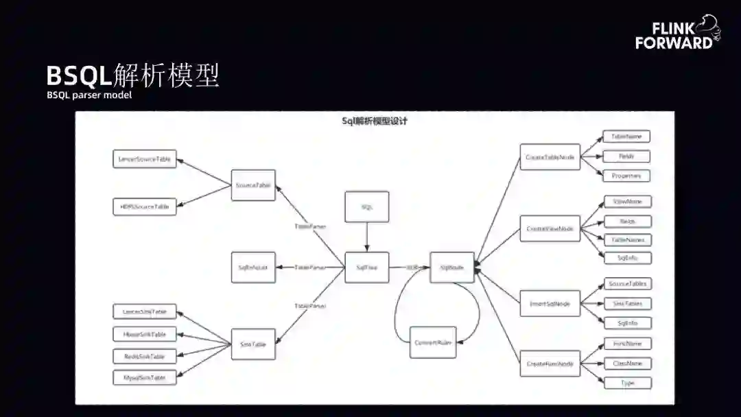 BSQL 解析模型:BSQL 解析模型拓扑展开如下图。当用户提交了一个 SQL,目标是将 SQL 转化成树。之后可以获取 SqlNode 节点。SqlNode 节点中有很多元数据信息。在 SqlNode 树的情况下实现 Table 解析器,将不同的 SqlNode 节点转化成 Flink 相应的 Streamer 进行映射。