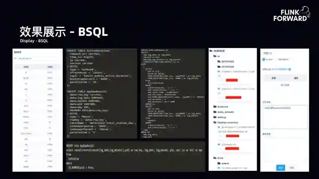 效果展示-BSQL:用户根据选择的表的输入源的 schema 编写相应的 SQL。最后选择相应 UDF 就可以提交到相应集群。