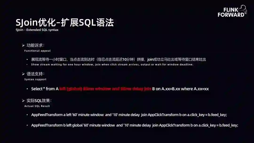 SJoin 优化-扩展 SQL 语法:扩展 SQL 的功能诉求是展现流等待 1 小时窗口,当点击流到达时,不立即吐出 Join 完成的数据,而等待窗口结束后再吐出。故扩展了 SQL 语法,虽然目前未达到通用,但是能满足诸多部门的 AI 需求。语法支持 Select * from A left(global)$time window and $time delay join B on A.xx=B.xx where A.xx=xx。给用户带来了很大收益。