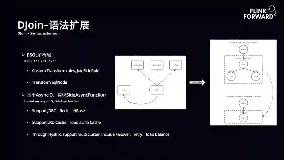 DJoin-语法扩展:DJoin 语法扩展与 SJoin 语法扩展类似,对 SQL 树子树进行转化,通过 AsyncIO 进行扩展,实现维表。