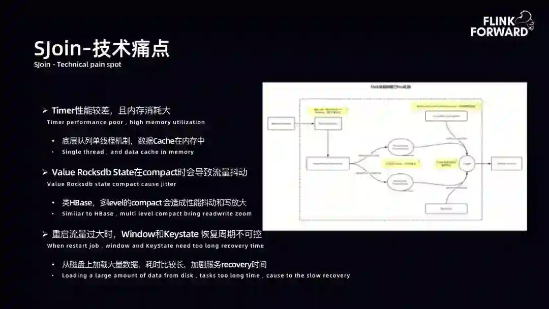 SJoin-技术痛点:下图是 Flink 使用 WindowOperator 时的内部拓扑图。用户打开窗口,每一条记录都是一个 Window 窗口。第一个问题是窗口分配量巨大,QPS 与窗口分配量基本持恒。第二个问题是 Timer Service 每一个记录都打开了一个窗口,在早期原生 Flink 中是一个内存队列,内存队列部分也存在许多问题。底层队列早期是单线程机制,数据 Cache 在内存中,存在许多问题。