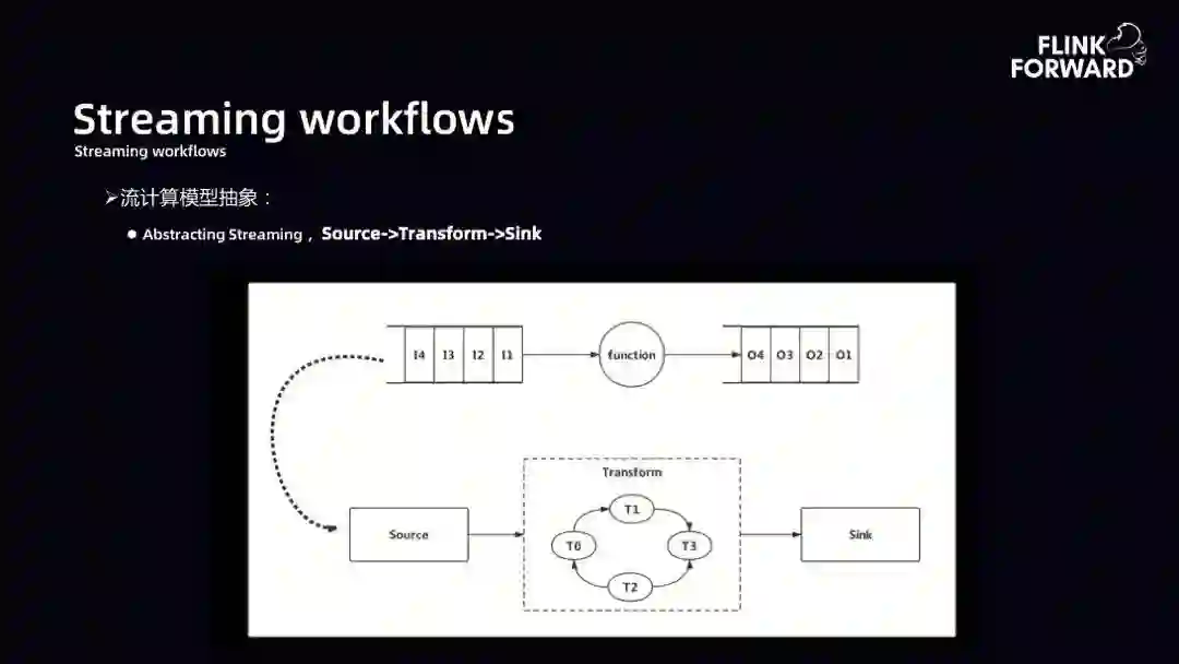 Streaming workflows:下图为流计算模型抽象。大数据计算引擎的本质是数据输入经过一个 function 得到输出,所以 function 本质是一个能够做 DAG 转换的 Transform。Saber 平台期望的流计算抽象形态是提供相应的 Source,计算过程中是一个 Transform 的 DAG,最后有一个 Sink 的输出。