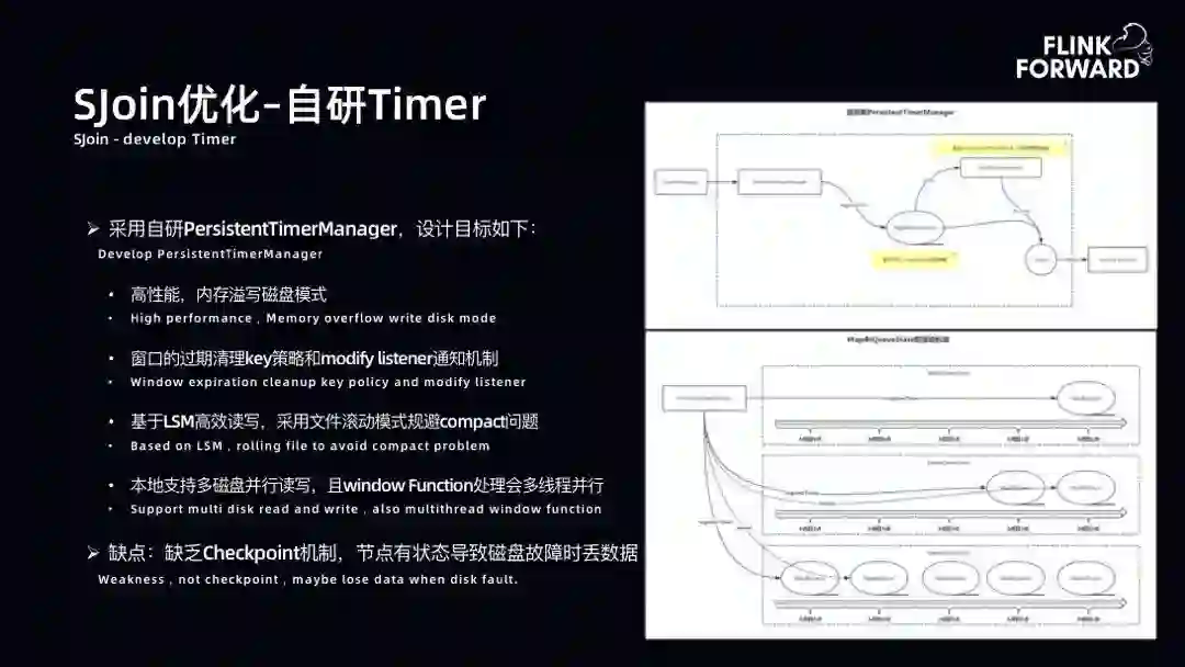 SJoin 优化-自研 Timer:实现将内存数据达到 Max 之后溢写到磁盘。底层用 MapDB 做磁盘溢写。磁盘溢写原理是 LSM 模型,同样存在数据抖动问题。由于窗口是 1 小时,相当于数据以 1 小时为单位进行 State 管理。如下图右侧所示,当 0 点到 1 点的 1 小时,由于记录在 1 小时后才会吐出,数据进来只有写的动作。在 1 点到 2 点,数据会写入到新的 State,0 点到 1 点的 State 已经到达窗口时间,进行数据吐出。自研 Timer 很好地解决了数据的读写问题和抖动问题。但是由于自研 Timer 缺乏 CheckPoint 机制,如果节点上的磁盘出现故障,会导致 State 数据丢失。