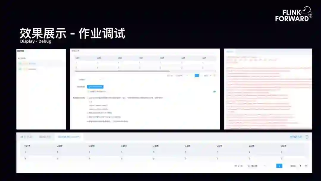 效果展示-作业调试:如下图所示为平台支持的作业调试。如果只有 SQL 开发却没有作业调试环节,是令用户痛苦的。故平台支持通过文件上传的方式以及线上采样的方式进行作业调试 SQL。