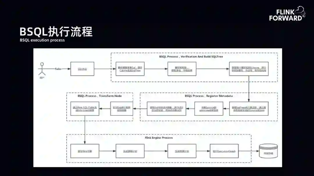 BSQL 执行流程:用户提交 SQL,BSQL 首先进行验证并构建 SQL 树。验证与构建主要是提取表名、字段信息,从元数据库中提取 schema 验证 SQL 的规范性、完整性和合法性。验证完成后,将输入表和结果表注册到 Flink 的运行时态,其中还包括 UDF 和 watermark 信息的完善。另外,平台对 SQL 有一些扩展。第三块是扩展的核心工作,将 SQL 树中扩展的子树转换为新的节点,然后将 SQL 的 DAG 提交到 Flink 上运行。