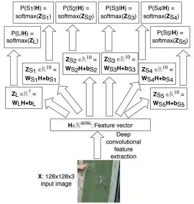 此方法主要用于街牌号识别,对每个字符识别的架构为:先使用卷积网络提取特征,然后使用N+1个softmax分类器对每个字符进行分类。具体流程如下图所示: