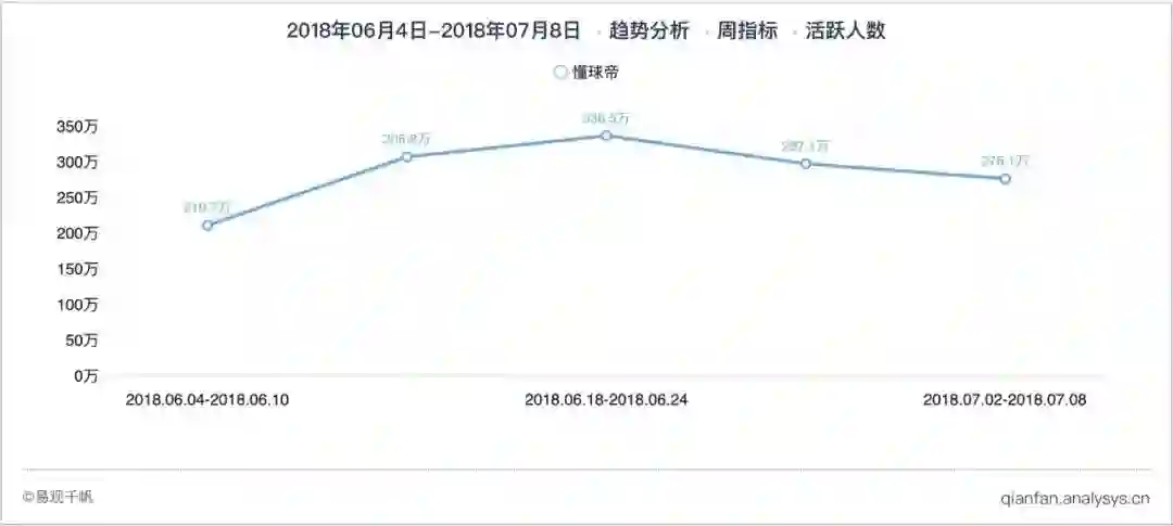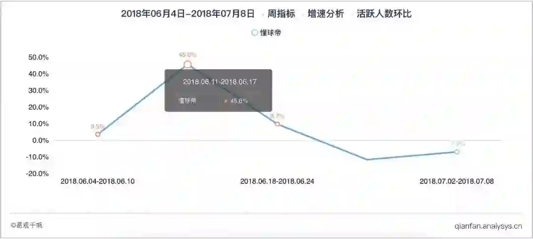 在周活跃规模增速方面,世界杯赛事第一周,懂球帝App可谓一骑绝尘,环比增长达到45.6%,第二周增速开始减缓,但也达到了9.7%。随着赛事逐步收尾,活跃规模开始回落,增速开始为负。易观千帆最新数据显示,由于世界杯赛事效应,2018年6月,懂球帝App活跃规模405.6万,环比增长15.0%。