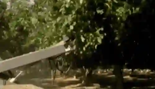 收集核桃时,是用机械振动机和清扫机,把核桃摇摇摇摇下来的。