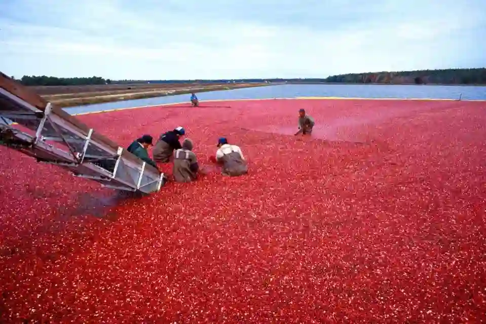 蔓越莓深受美国人的喜爱,美国家庭感恩节的应景食物除了火鸡,还要有蔓越莓果酱。但蔓越莓在做成酱之前,有种奇葩的收获方法。它不像葡萄干抖抖抖抖下来,也不像核桃摇摇摇摇下来,而是在蔓越莓田周围用土搭成一个圆堤,等到收获时就往堤内灌水,完全淹没藤蔓,通过机器搅打,让成熟的果实脱落后浮到水面,再用抽水机将蔓越莓抽走,完成收割。