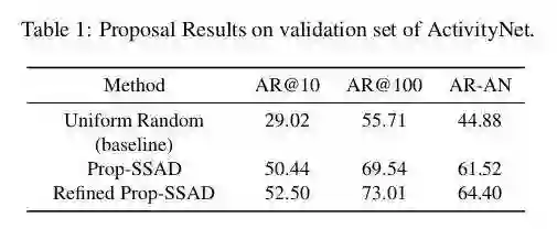 对于该任务,由于在测试集上只能看到最终的AR-AN面积指标,所以实验部分我们给出的是验证集上的结果。下表中是proposal 任务的基线方法,Prop-SSAD方法和 修正的Prop-SSAD方法的性能,可以看出边界的修正对于Proposal的召回率有进一步的提高效果。
