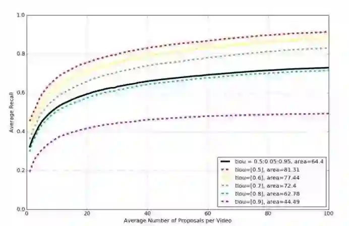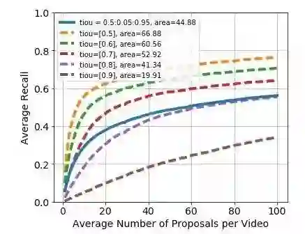 Proposal任务由于无需对时序片段进行分类,所以通常使用average recall (AR) 来进行评估。在此次竞赛中,Average Recall vs. Average Number of Proposals per Video (AR-AN) 曲线下的面积被作为最终的评测指标。举个例子,AN=50 时的AR分数 可以理解为对于每个视频,使用proposal set中分数最高的前50个proposal时,所能达到的召回率。下图为官方提供的baseline方法的AR-AN曲线。