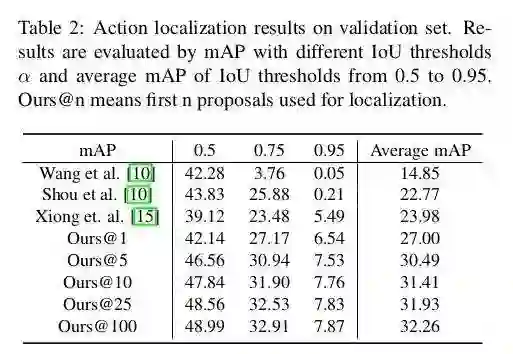 如下表所示是我们的temporal action localization方法在 验证集上的效果。其中Ours@n 代表每个视频使用proposal 集合中的前n个proposal。从表中可以看出,proposal 集合中分数最靠前的一小部分proposal 贡献了大部分的localization mAP。