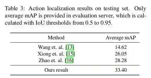在获得了proposal后,我们还需要对其进行分类从而得到最终的localization结果。由于ActivityNet上大部分视频中只有一类动作,因此我们直接使用了video-level的分类结果作为对应视频所有proposal的类别。