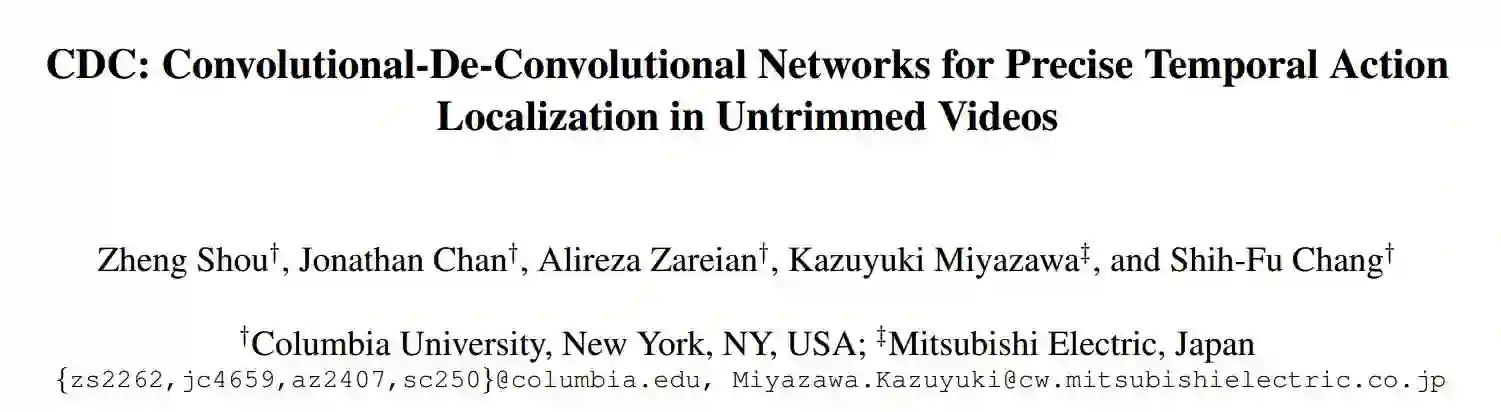 我们使用自行设计出的 CDC 过滤器构建了一个 CDC 网络,专门用于对时序动作进行精确的定位。可以使用原始视频对该 CDC 网络进行高效的端对端训练,以得出密集的分数,用以预测动作实例的精确时间边界。
