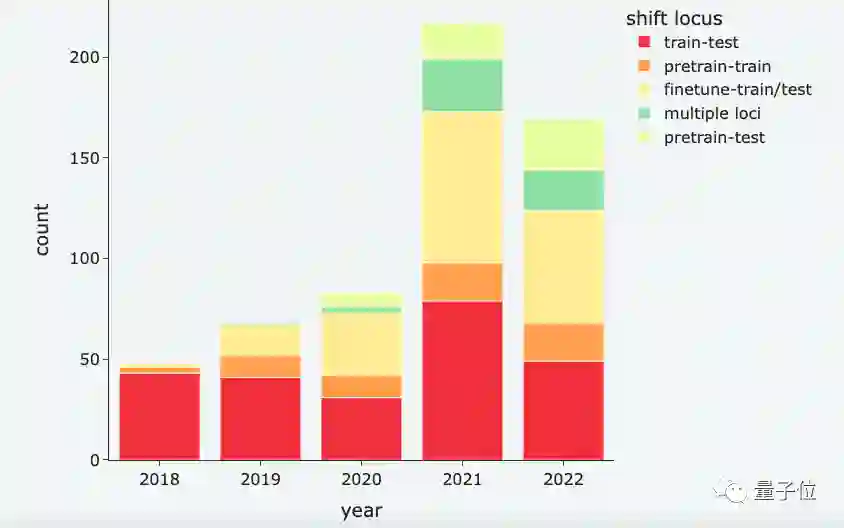 这其中,早期研究论文发生变量偏移集中在训练到测试过程中,但2020年后,更多偏移问题发生在微调到测试过程之间。