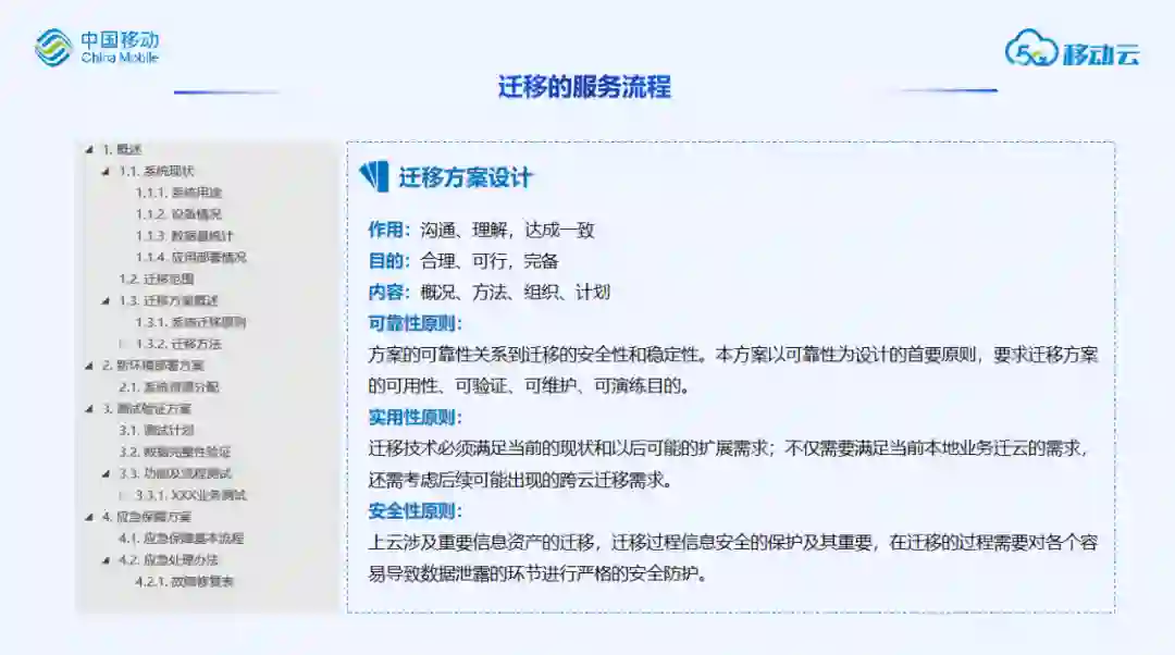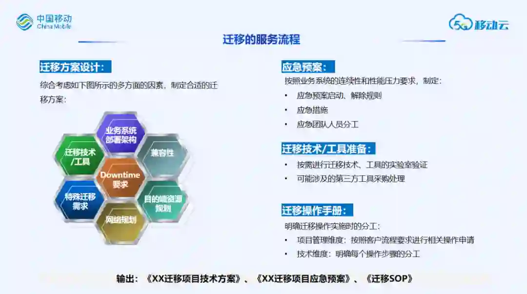 接着是迁移方案设计、应急预案制定、迁移技术工具/准备、迁移操作手册制定。