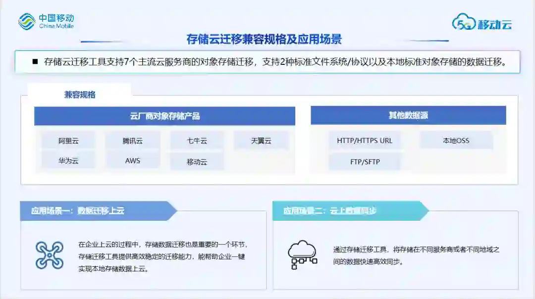 目前存储云迁移工具支持7个主流云服务商的对象存储迁移,支持2种标准文件系统/协议以及本地标准对象存储的数据迁移。目前支持阿里云、腾讯云、七牛云,天翼云、华为云、AWS、移动云的对象存储,同时还支持HTTP/HTTPS地址、本地OSS以及FTP/SFTP数据源。这里给大家说明一下存储云迁移的应用场景: