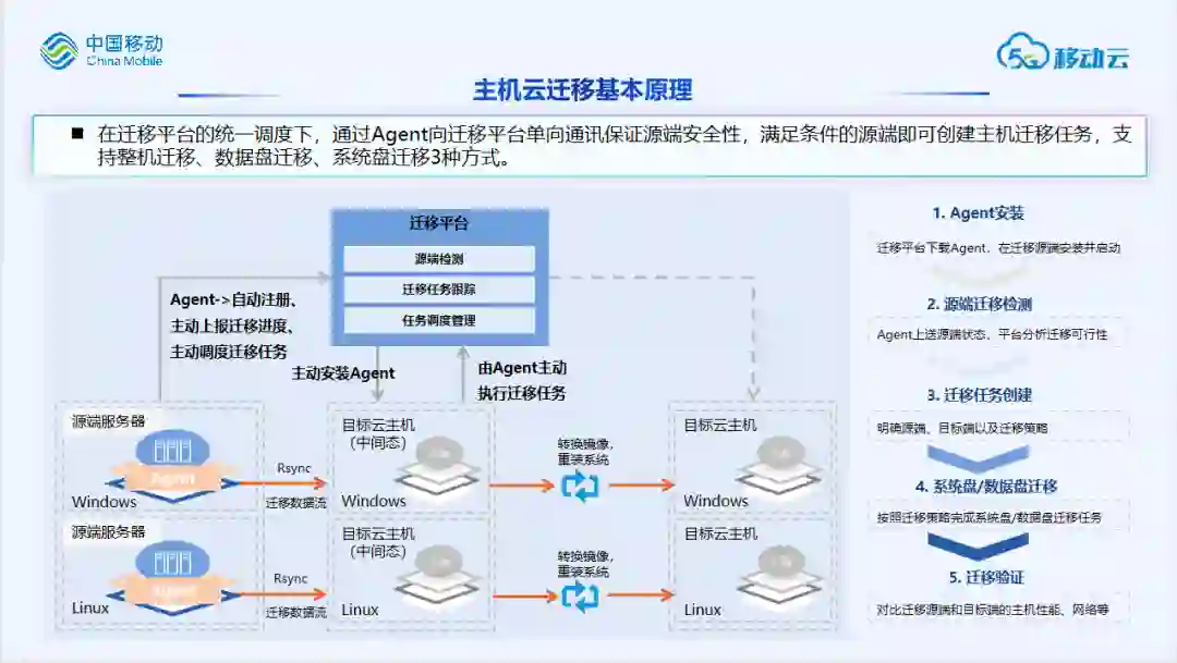 主机云迁移产品主要实现一键完成主机迁移的功能,在迁移平台的统一调度下,通过Agent向迁移平台单向通讯保证源端安全性,满足条件的源端即可创建主机迁移任务,支持整机迁移、数据盘迁移、系统盘迁移3种方式,迁移前需要在待迁移的源端服务器根据不同的操作系统安装客户端,启动客户端后会将源端的机器配置、进程等必要信息上报到平台,平台会同步检测源端是否满足迁移的必要条件,检测通过后源端这边相关的配置基本结束,开始任务后,首先会根据迁移任务配置,将源端的系统盘数据与数据盘数据对应传输到目标机对应的磁盘,这里主要是采用了Rsync技术,数据传输完毕后会利用目标机存放源端系统盘数据的磁盘制作自定义镜像,镜像中就包含了源端系统盘所有的数据,这个镜像会在本地保存一份,同时也会同步到移动云的镜像服务产品中,后续可以利用该自定义镜像重新拉起云主机,这样就基本完成了主机系统盘的迁移,对于数据盘的迁移就是将源端的数据盘数据完整、无误的迁移到对应的云硬盘,然后在挂载到对应的云主机即可。