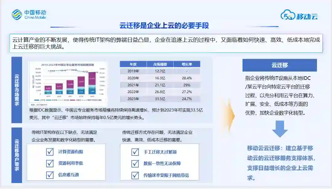 伴随着企业的不断发展,传统IT架构的缺点也越来越明显,比如计算资源有限、资源利用率低、信息难互通等问题,这些传统架构的弊端也在一定程度上加速了云计算的发展,根据IDC数据显示,中国云专业服务市场规模将持续保持高速增长,预计到2023年可实现33.5亿美元,其中“云迁移”市场始终保持每年0.5亿美元的增长势头,而企业在追逐上云的过程中,又面临着如何快速、高效、低成本地完成上云迁移的巨大挑战。