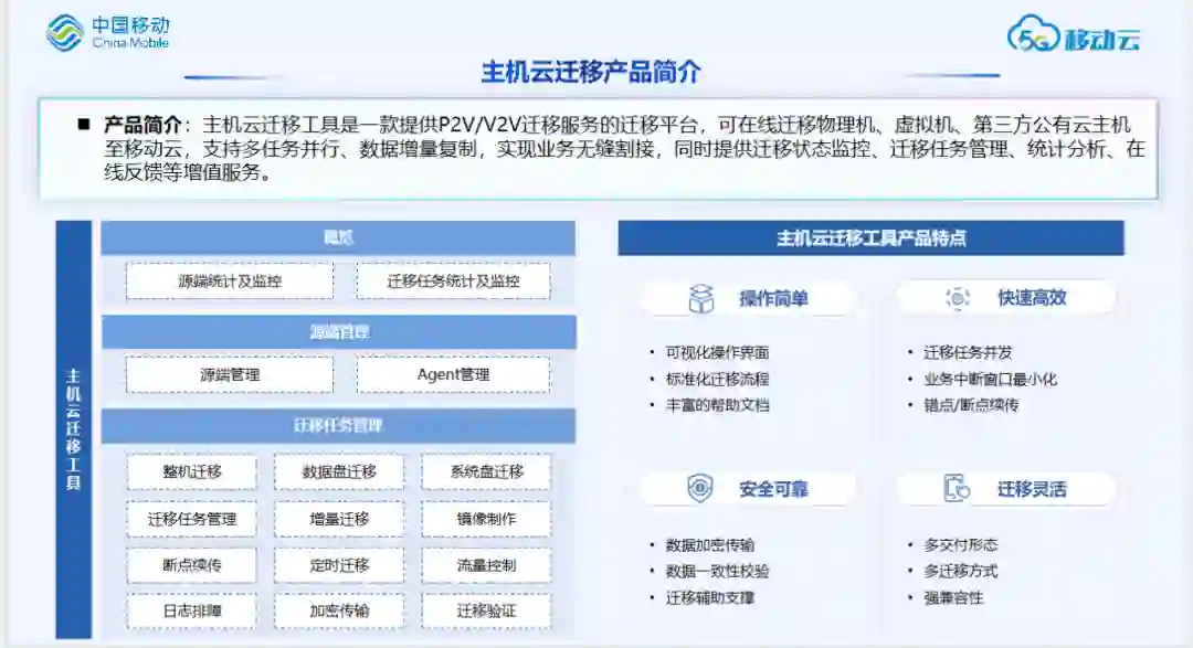 主机云迁移工具是一款提供P2V/V2V迁移服务的迁移平台,可在线迁移物理机、虚拟机、第三方公有云主机至移动云云主机,支持多任务并行、数据增量复制,同时提供迁移状态监控、迁移任务管理、统计分析、在线反馈等增值服务。