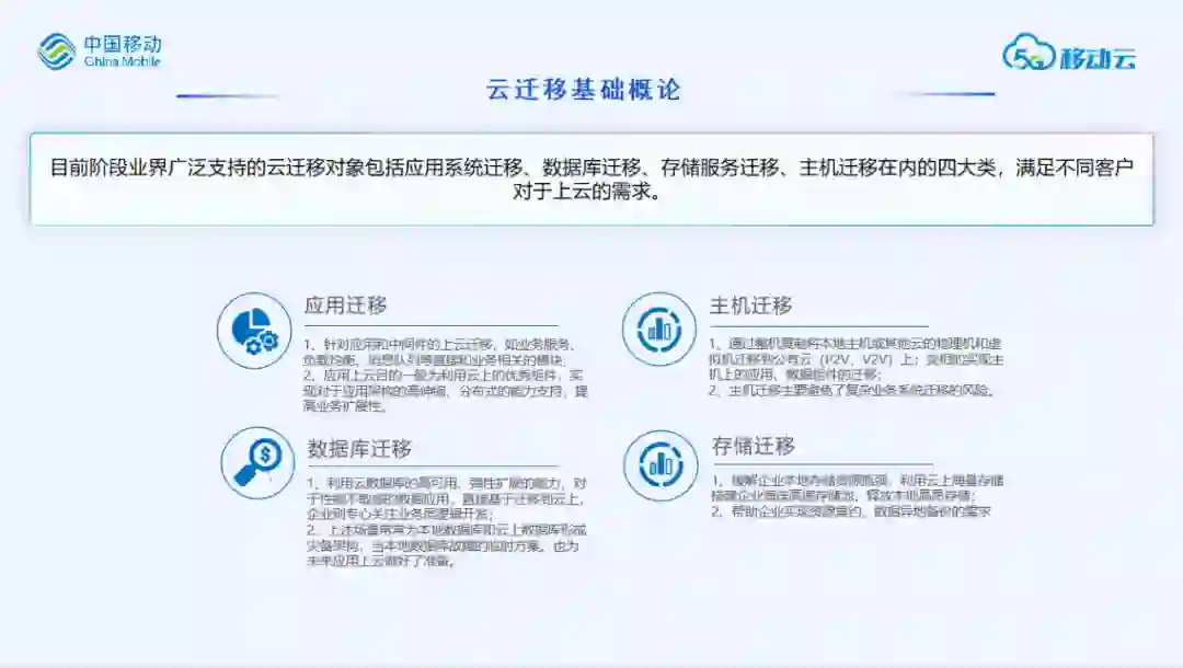 目前阶段业界广泛支持的云迁移对象包括应用系统迁移、数据库迁移、存储服务迁移、主机迁移在内的四大类,满足不同客户对于上云的需求。