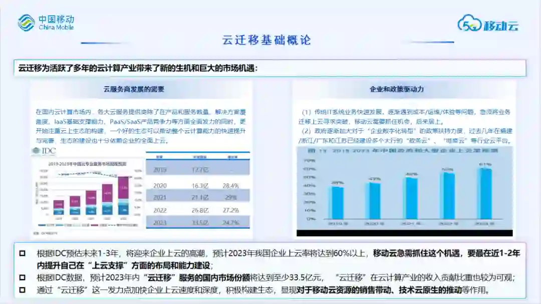 根据IDC预估未来1-3年,将迎来企业上云的高潮,预计2023年我国企业上云率将达到60%以上,移动云急需抓住这个机遇,要最在近1-2年内提升自己在“上云支撑”方面的布局和能力建设;根据IDC数据,预计2023年内“云迁移”服务的国内市场份额将达到至少33.5亿元, “云迁移”在云计算产业的收入贡献比重也较为可观;通过“云迁移”这一发力点加快企业上云速度和深度,积极构建生态,显现对于移动云资源的销售带动、技术云原生的推动等作用。