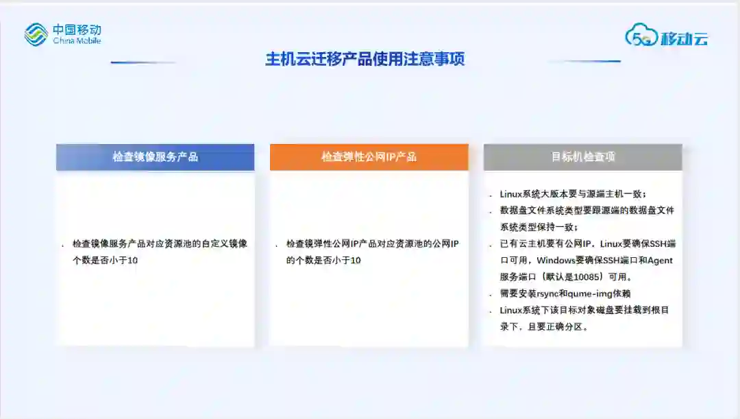 在使用主机云迁移产品进行主机迁移之前,有一些注意事项与检查项,主要有如下三个方面: