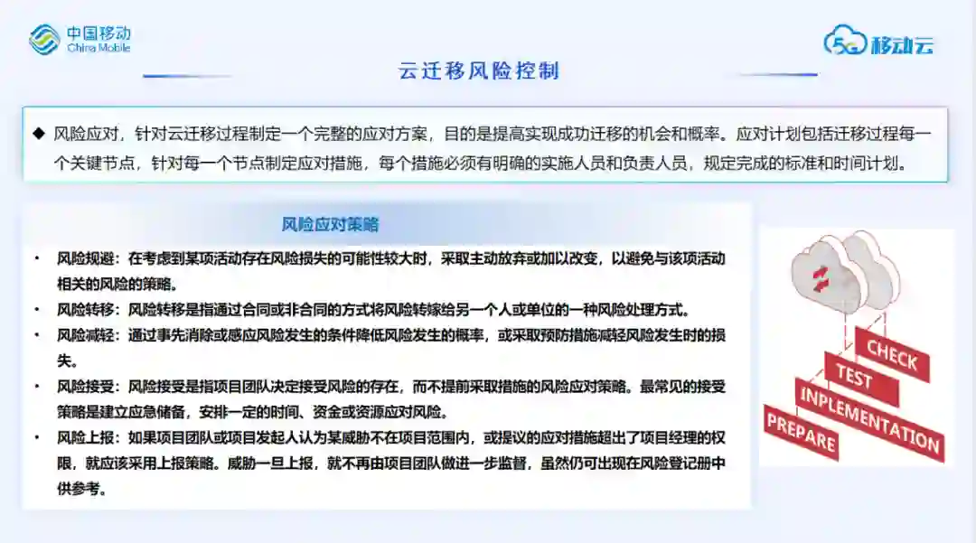风险应对,针对云迁移过程制定一个完整的应对方案,目的是提高实现成功迁移的机会和概率。应对计划包括迁移过程每一个关键节点,针对每一个节点制定应对措施,每个措施必须有明确的实施人员和负责人员,规定完成的标准和时间计划。