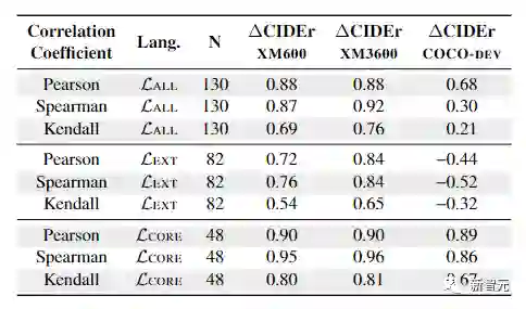 当比较成对的模型时,研究人员观察到模型输出的 CIDEr 得分的差异之间有很强的相关性,并且同时比较模型输出的人类评价,可以发现XM3600是一个可靠的工具,能够高质量的自动比较之间的图像字幕模型在英语以外的各种语言。