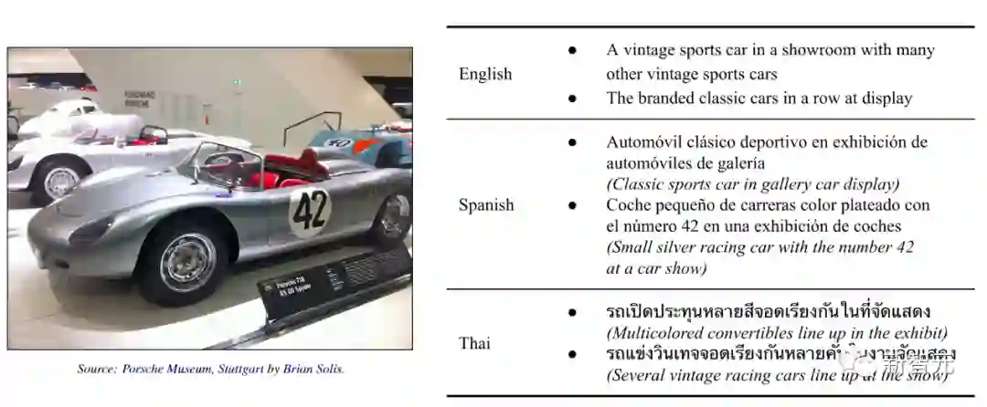 每张图像都会提供多个标题,文本内容也会尽可能贴合当地文化,而不只是翻译,比如下面这张汽车的图像,西班牙语的描述中提到了「数字42」,泰语中的描述包括「敞篷车」等英语描述中没有出现的元素。