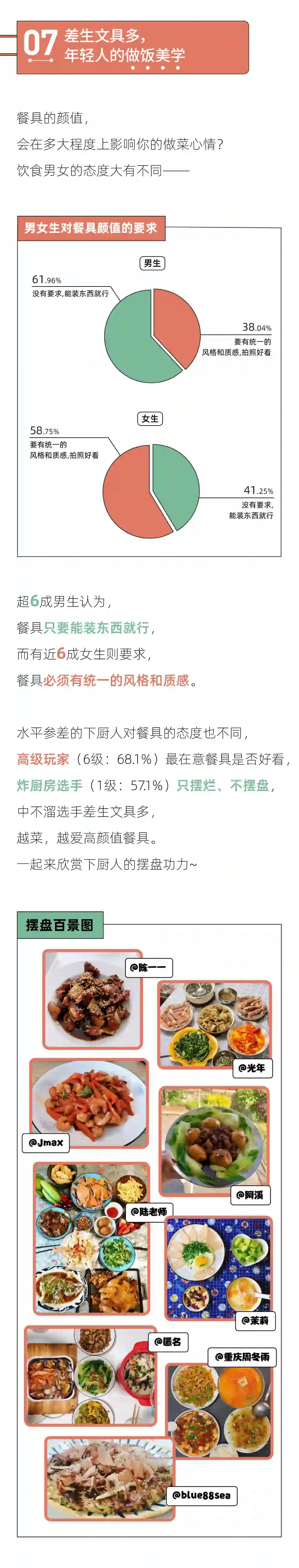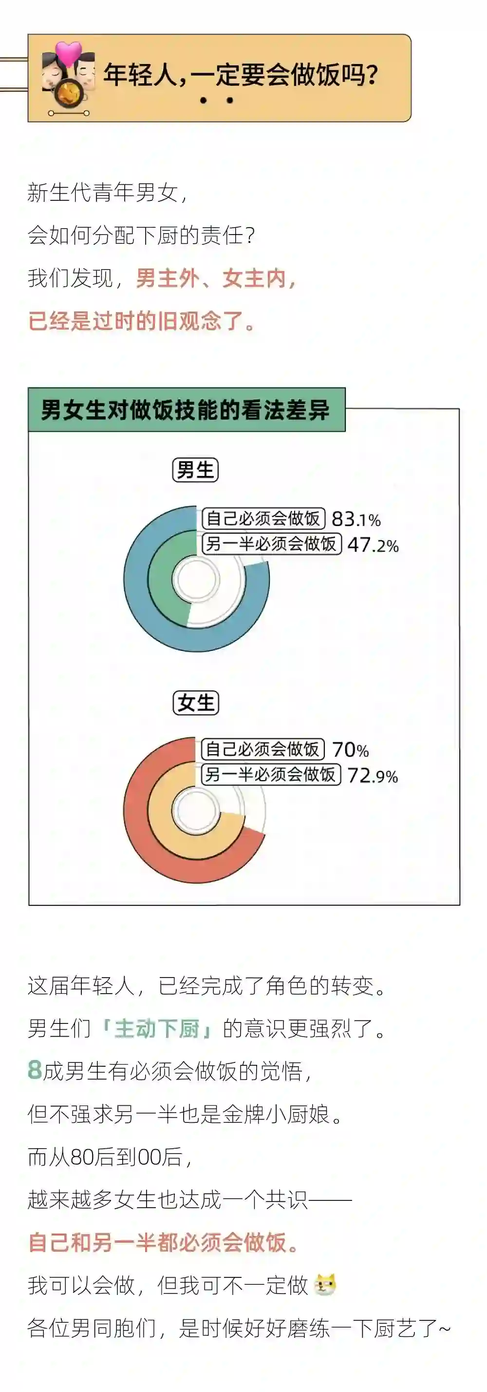 5、男生超过女生成为厨房主力军:7成女生要求另一半会做饭,而不到5成男生对另一半有同样的要求。越来越多男生涌入厨房,男女家庭职责或许会迎来一次调转?