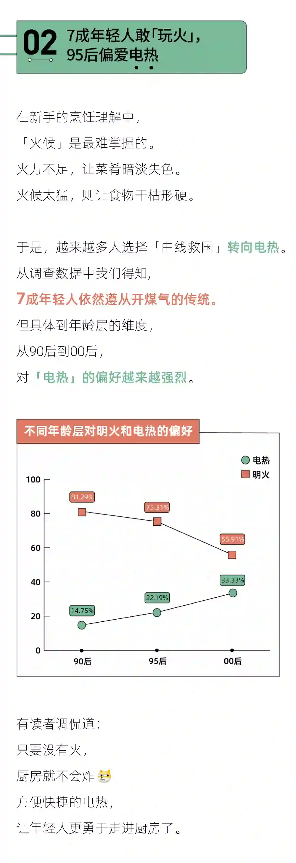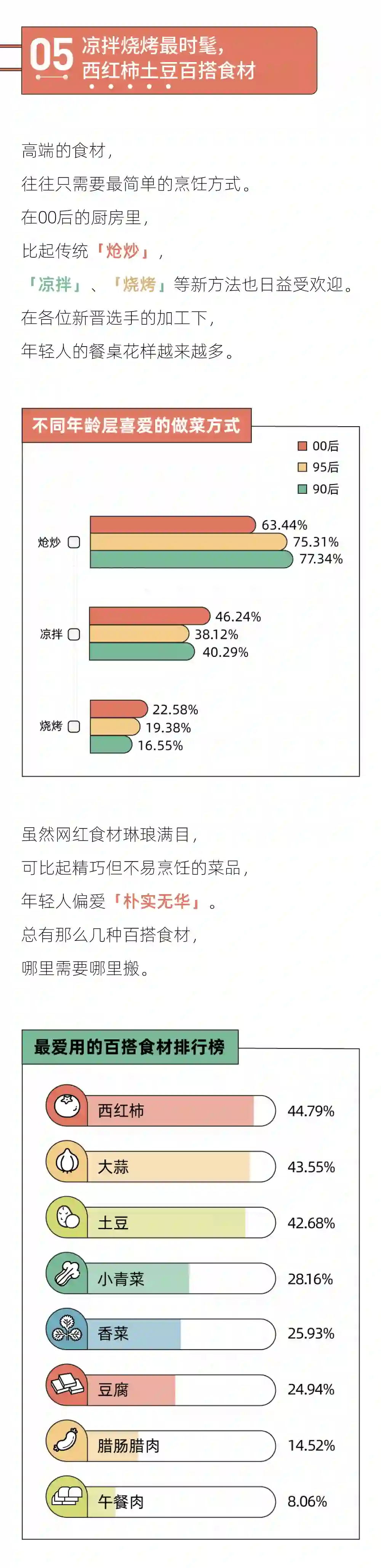 3、烹饪方式多元,凉拌烧烤崛起:虽然炝炒仍是最主流的方式,炖煮、蒸煮、凉拌、烧烤等简单烹饪方式也在年轻人中流行了起来,越是年轻,越爱烧烤凉拌。