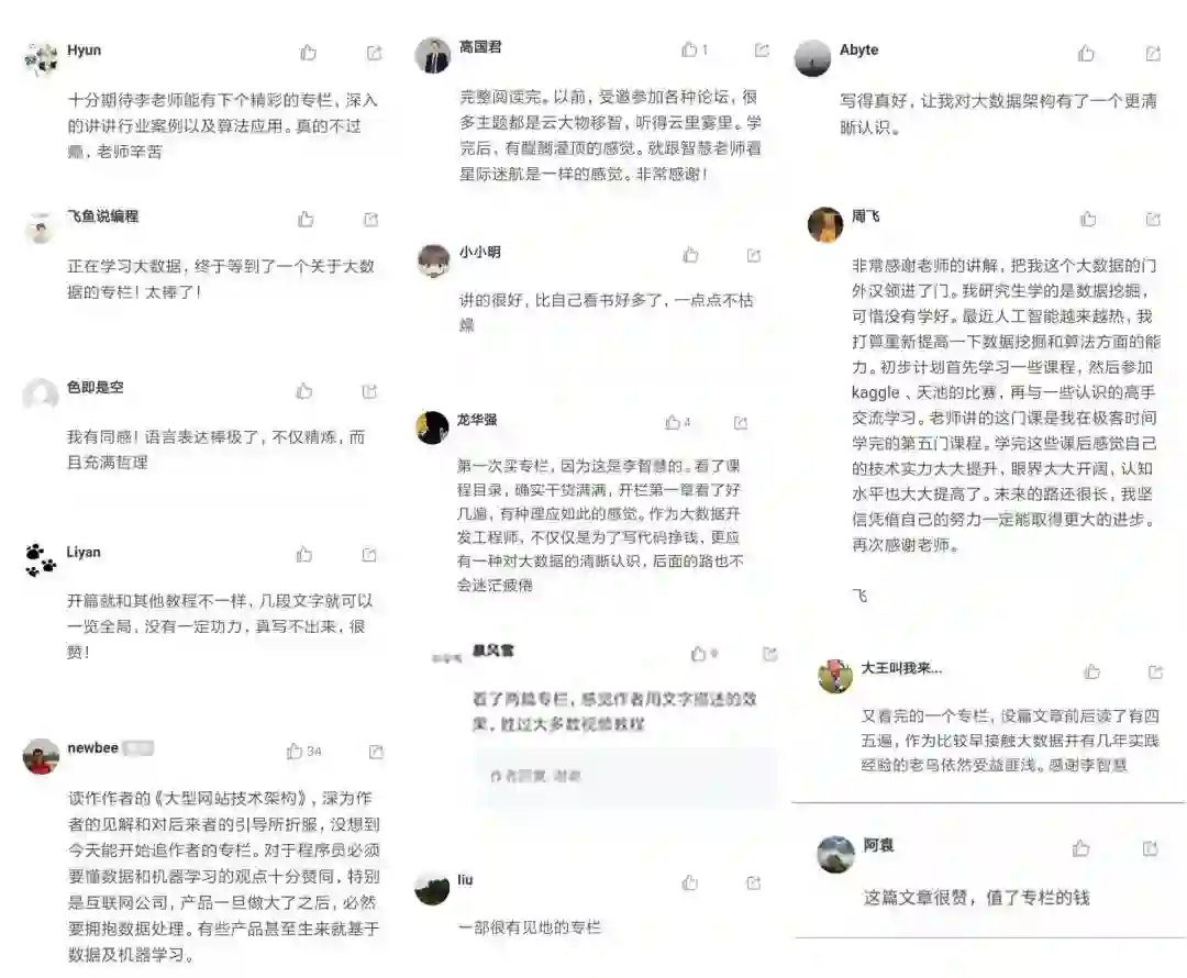 从大家之前的评价中可以看出:李智慧是极客时间的超人气老师,很擅长把复杂的内容讲得清晰、透彻,还能结合真实的场景案例,让你拿来就可以用到工作中。李智慧可以说是高并发领域真正的大牛,这一次他把 15 年来的架构设计经验,在新专栏中倾囊相授。