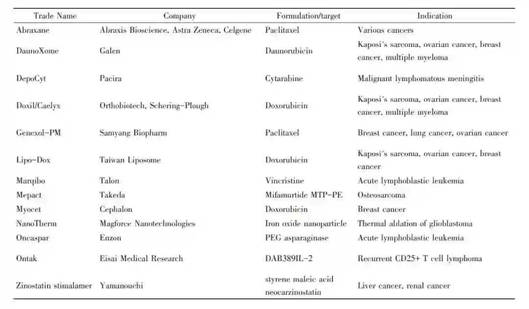 表 1 临床使用的抗癌纳米药物